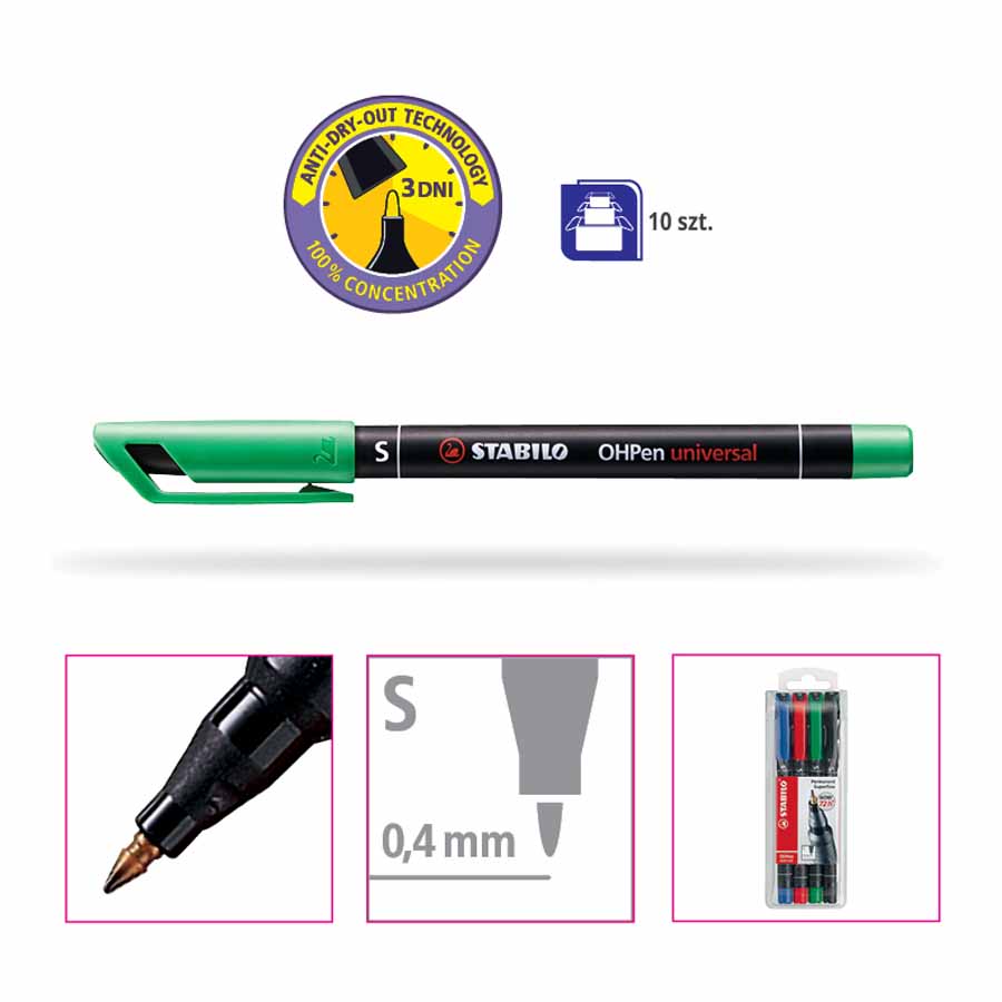 Zestaw foliopisów STABILO OHPen S w kolorach czarnym, czerwonym, zielonym i niebieskim jest niezwykle wszechstronny, idealny do pisania na szkle, torebkach foliowych, etykietach, zdjęciach, błyszczącym papierze, płytach CD oraz zdjęciach rentgenowskich. Ich uniwersalność sprawia, że są niezastąpione w wielu sytuacjach.