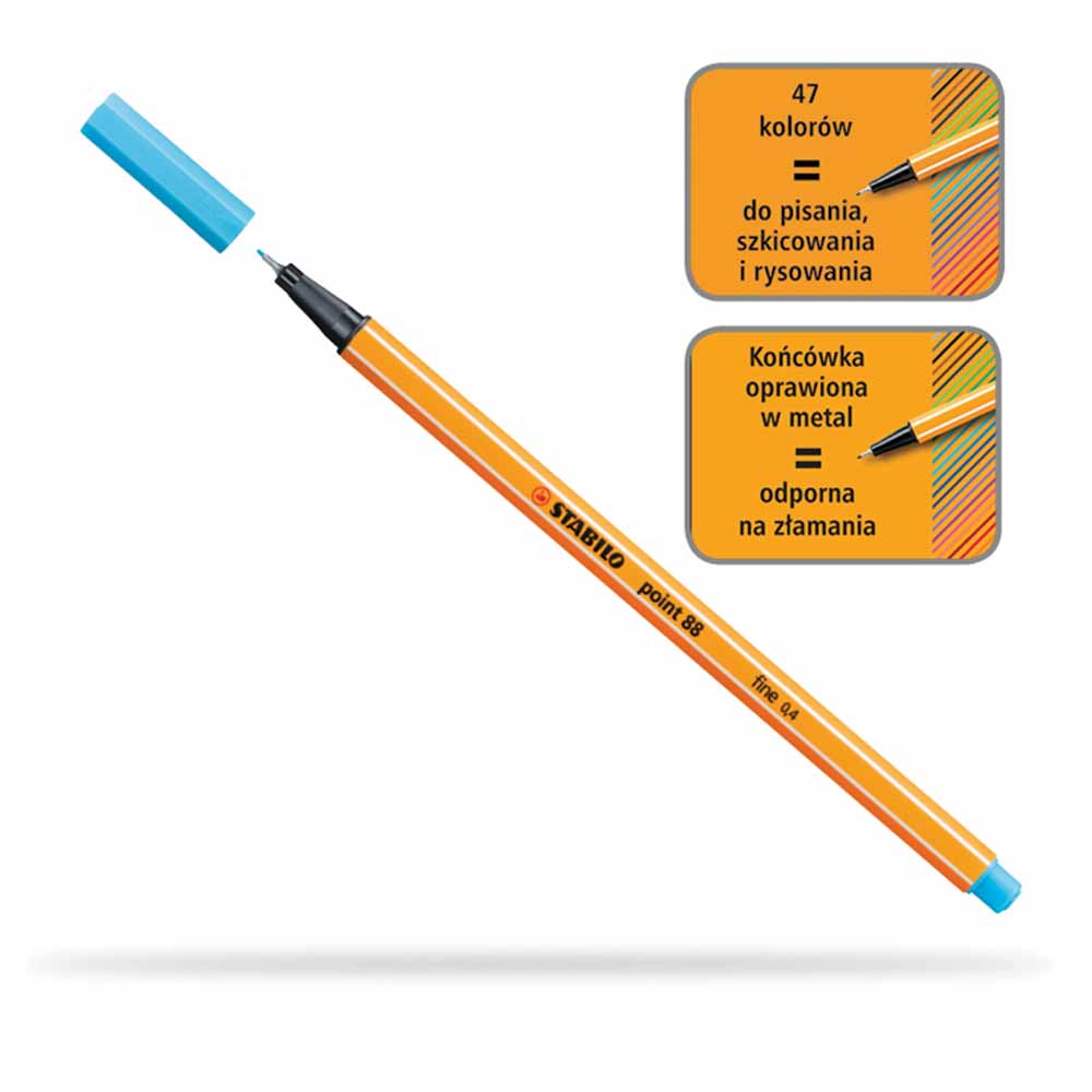Elementy obudowy cienkopisu są w kolorze tuszu, co ułatwia jego identyfikację. Tusz na bazie wody jest bezpieczny i ekologiczny, zapewniając jednocześnie intensywne i trwałe kolory.